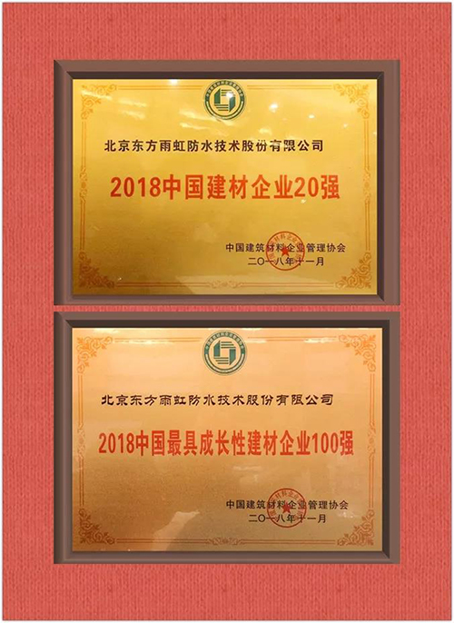 會上發(fā)布了2018中國建材企業(yè)500強等系列名單,東方雨虹榮獲“2018中國建材企業(yè)20強”“2018中國最具成長性建材企業(yè)100強”兩項殊榮。