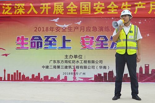 6月15日,廣東東方雨虹聯合中建二局第三建筑工程有限公司(華南)共同主辦的2018年安全生產月應急演練活動在廣州信達金茂廣場項目成功舉辦。廣東東方雨虹質安、項目管理人員及項目現場各單位項目經理、施工員約100余人參與本次活動。