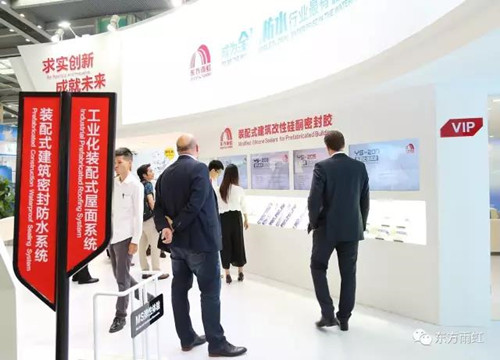 本次展會,東方雨虹攜明星產品——裝配式建筑密封防水系統巍然而立,全方位展示了東方雨虹從產品到應用服務的系統化服務特性。MS密封膠是以MS聚合物為主要材料的改性有機硅彈性建筑密封膠,基于新型端硅烷基聚醚預聚體技術進行開發。東方雨虹現已開發PC建筑專用(YS-202)、石材專用(YS-201)、建筑窗用(YS-203),建筑用(YS-205),基層處理底涂(YS-207)等類型產品。展會現場產品+性能實物體驗的方式,直觀表達了產品優異的耐久性、耐候性、耐熱性、耐污染性、涂飾性等綜合性能,吸引一批批專業觀眾的駐足咨詢。