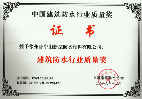 徐州臥牛山榮獲“建筑防水行業質量獎”