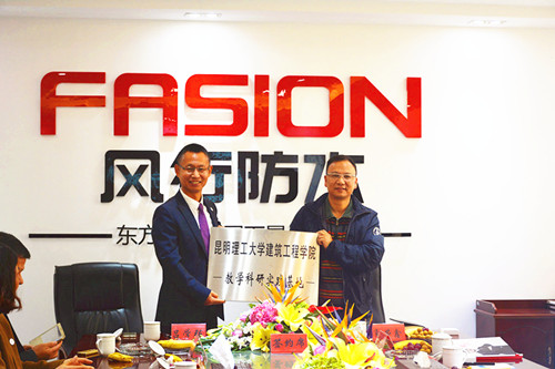 12月15日下午,風行防水與昆明理工大學建筑工程學院合作簽約儀式在風行防水安寧生產基地舉行。昆明理工大學建筑工程學院院長郭榮鑫、院黨委書記馬應良、副院長王志浩、院黨委副書記戴煒、辦公室主任王薇等有關領導出席簽約儀式。