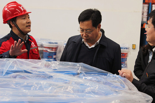 馬希良參觀了卷材車間、卷材庫房和涂料車間,并對東方雨虹先進(jìn)的設(shè)備、優(yōu)質(zhì)的產(chǎn)品和高科技的倉儲管理系統(tǒng)給予了高度的贊許和肯定。魯家華為考察團(tuán)介紹了咸陽生產(chǎn)基地具體情況,尤其是年產(chǎn)能2000萬平米的先進(jìn)卷材生產(chǎn)線:引進(jìn)自意大利BOATO的多功能防水卷材生產(chǎn)線和美國R&D公司的3000型防水卷材生產(chǎn)線。作為全球化的防水系統(tǒng)服務(wù)商,東方雨虹的生產(chǎn)基地正在向高科技全智能化企業(yè)發(fā)展。