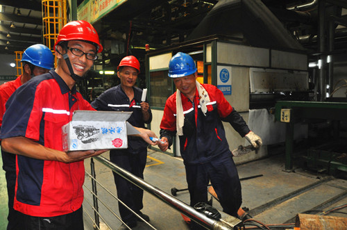 炎炎盛夏,熱浪滾滾,連日來,徐州市氣溫節(jié)節(jié)攀升,最熱時氣溫高達(dá)38度,驕陽似火,酷暑難耐。但東方雨虹的一線員工們依然堅守在崗位上,用他們的汗水確保公司的生產(chǎn)活動順利進(jìn)行。 7月26日、27日,東方雨虹徐州生產(chǎn)基地組織辦公室所有員工帶著公司的關(guān)懷,來到車間,給一線員工們送去了清涼解暑的綠豆湯、冰棍和冰鎮(zhèn)西瓜。雖然汗水已經(jīng)把大家的衣衫浸透,但炎炎夏日擋不住彼此的關(guān)愛和笑容,一次次傳遞,一聲聲辛苦,在送去涼爽的同時,也溫暖了員工們的心。
