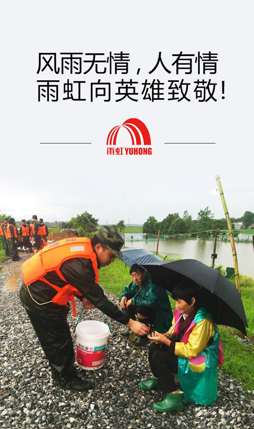 近日,南方多地區連降暴雨,安徽、武漢等地因長江水位上漲,遭遇嚴重的洪澇災害,東方雨虹決定用實際行動助力受災地區,7月1日起至7月31日,【雨虹天貓旗艦店】的每筆訂單中將撥款50元用作湖北、安徽等受災地區救援物資專項基金。
