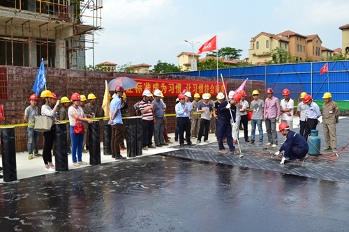 為提高防水工程施工質量和施工現場管理水平,解決因施工粗放而導致建筑滲漏率居高不下的問題,切實打造優質防水工程,東方雨虹決心在全國推行防水標準化施工服務體系。4月25日,東方雨虹工程渠道事業部與南寧東方雨虹防水工程有限公司共同組織舉辦了防水示范工地觀摩交流活動----東方雨虹嘉和城白鷺郡南山項目防水標準化施工推介會。 嘉和城項目施工現場警戒線、標示牌、司旗等一應俱全,工人們統一著裝,以良好的風貌列隊進場,嚴格執行標準化施工的要求。