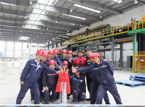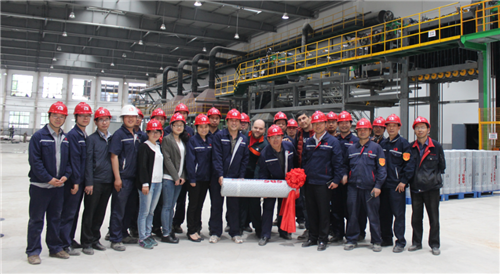 卷材車間員工和生產(chǎn)的第一卷卷材合影