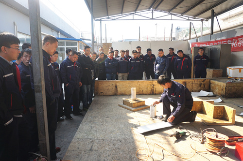 下午,《單程防水卷材屋面工程技術(shù)規(guī)程》及《TPO事業(yè)部施工流程梳理及材料管理》的宣貫,讓與會(huì)人員明確掌握了工程技術(shù)及施工過程中的規(guī)章制度,項(xiàng)目經(jīng)理組和工人代表組也就項(xiàng)目管理的經(jīng)驗(yàn)與施工技術(shù)作了分享,新同事們?nèi)绔@至寶,現(xiàn)場提問、討論同步進(jìn)行。 頒獎(jiǎng)環(huán)節(jié),現(xiàn)場為TPO事業(yè)部優(yōu)秀項(xiàng)目經(jīng)理王海東、崔巖,優(yōu)秀施工班組張廣志,優(yōu)秀施工員李冰,優(yōu)秀新人鐘魚,優(yōu)秀施工隊(duì)長高明坤等人頒發(fā)獎(jiǎng)勵(lì)及證書。 本次培訓(xùn)還組織TPO細(xì)部節(jié)點(diǎn)實(shí)操大賽,由2015中國屋面防水大師徐龍瀟現(xiàn)場演示陰陽角和管根的標(biāo)準(zhǔn)化施工實(shí)操及講解。TPO事業(yè)部的所有施工管理人員及班組組長聚精會(huì)神觀看,精益求精的施工工法引來陣陣驚嘆。