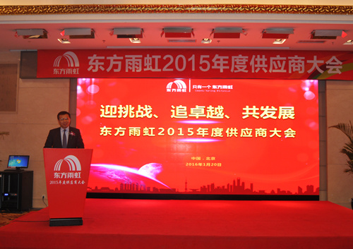 1月20日,東方雨虹2015年度供應商大會在北京順利召開。會議以“迎挑戰,追卓越,共發展”為主題,供需雙方對今后繼續開展戰略合作進行了深入探討。賽拉尼斯、巴斯夫、瓦克等共計50家供應商參會。東方雨虹執行董事長向錦明、防水集團副總裁陳永初、財務總監徐瑋、采購供應副總監楊曉菲等出席。