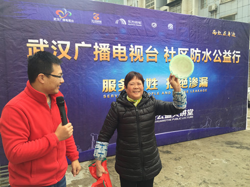 2015年12月6日,“服務百姓 拒絕滲漏”公益大講堂在武漢的最后一場活動在硚口區百姓之春社區開講,近兩百名業主參與了本次活動。   2015年,東方雨虹聯合武漢廣播電視臺在武漢十大社區開展服務百姓拒絕滲漏活動,累計服務人群達4000余人,滲漏診治63戶,免費維修名額十戶。活動共斥資數十萬,旨在改善百姓居住環境,降低房屋滲漏情況,和諧鄰里關系。     活動當天,武漢高級區域經理鐘濤鋒為百姓提供了專業實用的家裝防水知識以及防水滲漏診治方法的講解,并對如何識別防水材料真偽、滲漏發生后的緊急救援措施進行了科普。他專業通俗的講解方法,讓老百姓在最短的時間獲得了豐富的防水知識,得到全場觀眾的一致好評。