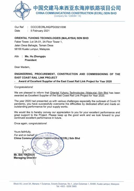 日前,東方雨虹(ORIENTAL YUHONG)喜獲2020年中國交建馬來西亞東海岸鐵路項(xiàng)目總經(jīng)理部年度優(yōu)秀供應(yīng)商稱號(hào)。