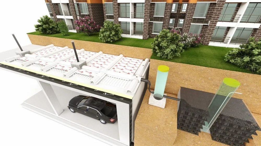 桃花源系統具有防水阻根、零度找坡、海綿理念等三大特點。不僅為建筑結構提供持久可靠的柔性保護,還能通過蓄水模塊將雨水收集再利用,滿足節水和水資源利用要求,符合綠色建筑和海綿城市建設要求。
