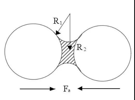 水份向表面的遷移速率時,在靠近表面的粒子之間將會形成復雜的毛細管體系,如圖 3和圖4所示,并在毛細管壁產生毛細壓力 Pc,使毛細孔壁之間或由液體膜分開的兩顆粒之間產生收縮引力 Fa,使得兩粒子被壓縮靠近,此時混凝土尚未形成強度,當收縮驅動力大于顆粒間的抗拉強度時,則出現塑性收縮裂縫,主要發生于早期。