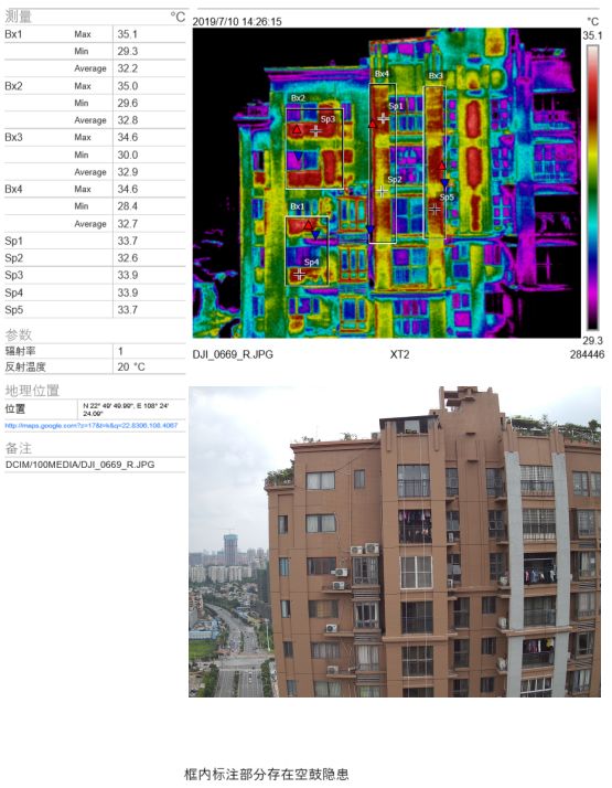 近年來,隨著建筑外墻粘貼面磚的普遍采用,建筑外墻面磚粘接劑空鼓脫落現象也經常發生。本文針對以下紅外熱成像儀所檢測的圖片所展現的空鼓問題,提出技術方案。