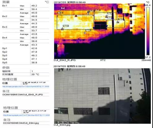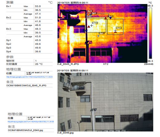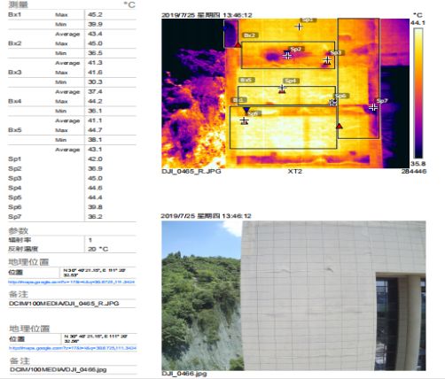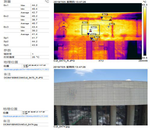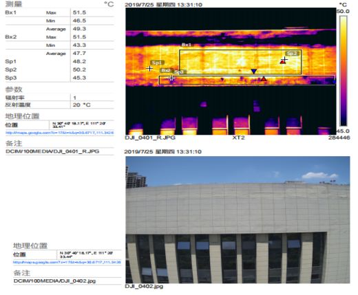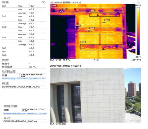 某地區(qū)中級人民法院外墻無機保溫砂漿保溫層出現(xiàn)脫落、滲漏現(xiàn)象,經(jīng)過勘查檢測(檢測設(shè)備為無人機搭載紅外熱成像雙光攝像頭),判斷整體外墻目前存在的各類缺陷及其嚴(yán)重程度,從而尋找合理、有效的解決方案,解決外墻問題,消除外墻帶來的安全隱患。