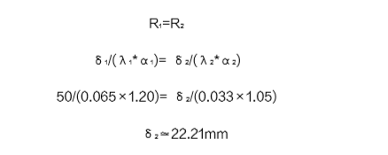 譬如原設計采用發泡水泥板,設計厚度δ1=50mm,材料導熱系數λ1=0.065,修正系數α1=1.20。如想替換成石墨聚苯板,材料導熱系數λ2=0.033,修正系數α2=1.05,則替換后的石墨聚苯板設計厚度δ2應為: